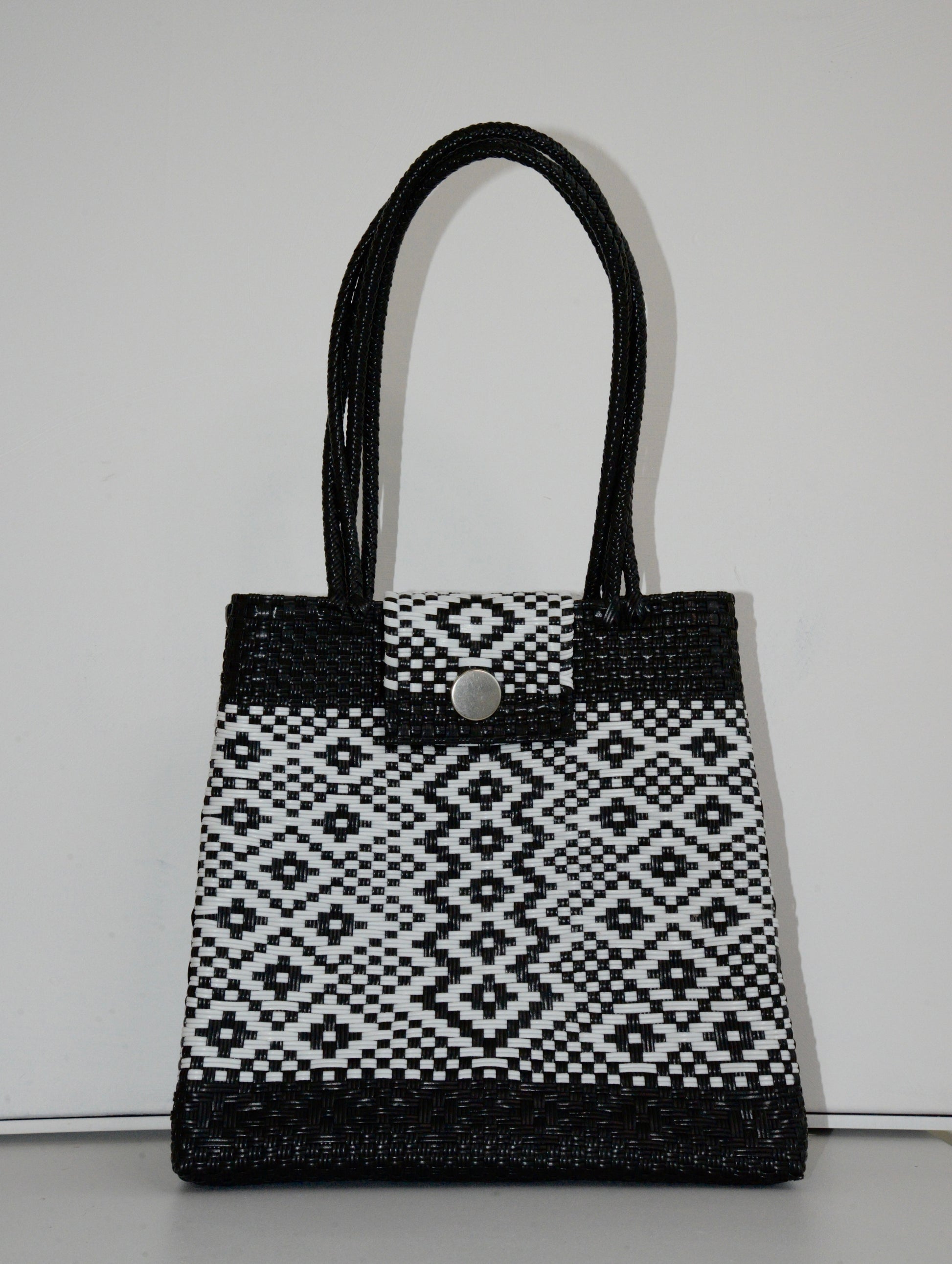 Purse is hand made from a reusable plastic. Limited stock available for this design. Metal buckle to close purse.